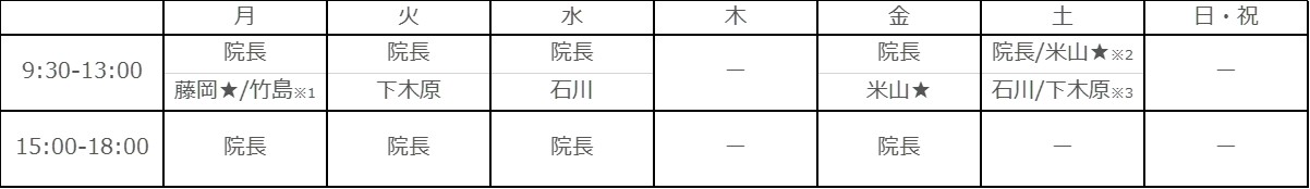 ※1 第1・3・5週;藤岡医師、第2・4週;竹島医師 ※2 第1・3週;米山医師、第2・4・5週;院長 ※3 第1・3・5週;石川医師、第2・4週;下木原医師 ★女性医師;米山医師、藤岡医師
